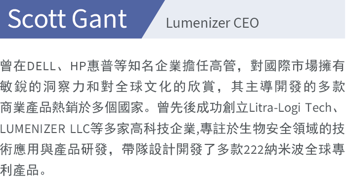 2020年成立於美國德州奧斯汀市,LUMENIZER與國際遠紫外大會ICFUST和星際光公司在222納米波技術領域有著緊密合作,其領先的222納米波產品擁有多項全球專利和UL、CE、FCC等國際權威認證,受到包括聯合國、世衛組織等眾多應用方的高度肯定。
