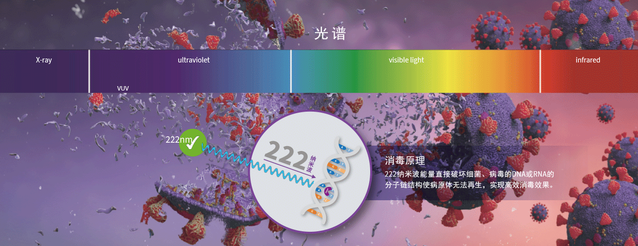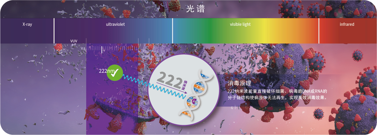 人類已知唯一可以安全即時消殺氣溶膠病原體的技術222納米波無法穿透皮膚和眼睛,卻可以破壞細菌、病毒中的DNA或RNA的螺旋結構,使病原體無法再生。安全空間建立在222納米波作用的過程中,即時稀釋空氣中的病毒載量,以達到對空間的持續保護。